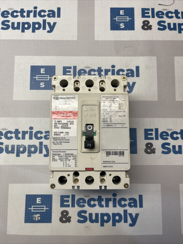 HFD3070 | Eaton | 70 Amp | 600 VAC | 3 Pole | New Surplus HFD 65k Industrial Circuit Breaker
